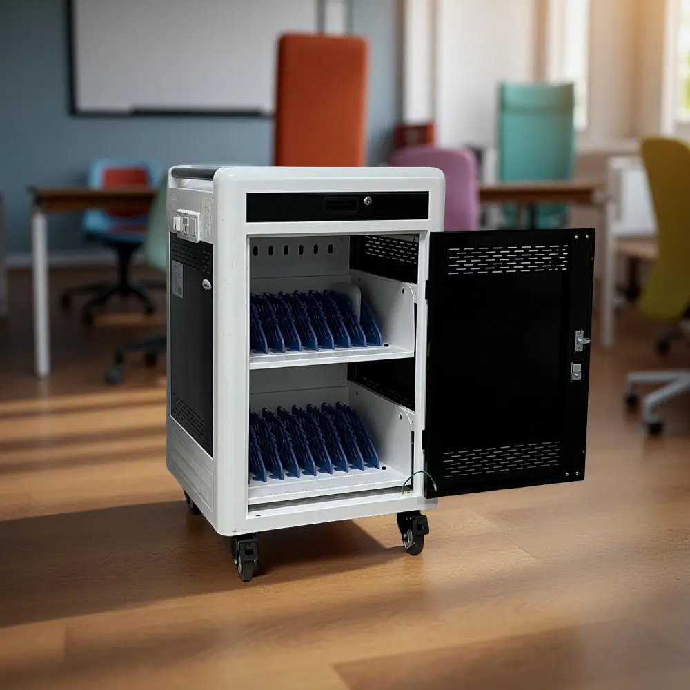 • Le chariot multimédia est idéal pour transporter et recharger un parc important d’équipements (jusqu’à 30 postes). Il peut inclure des fonctionnalités avancées : ventilation, synchronisation des appareils, borne Wi-Fi intégrée…