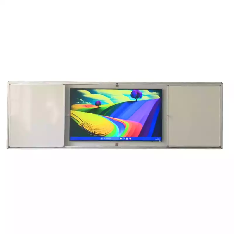 Araboard 4+ est une solution murale permettant de combiner 4 tableaux blancs, dont 2 coulissants, à un écran interactif jusqu'à 86 pouces. Avec notre tableau pour solutions interactives, écrivez, projetez et interagissez simultanément. Grâce à sa structure mécano-soudée robuste, vous optimisez vos espaces et dynamisez vos cours.