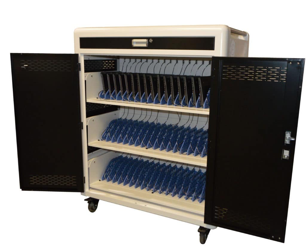 Cartice 50 est un chariot multimedia securise concu pour ranger et charger jusqu’a 50 tablettes ou PC portables 15,6 pouces.
