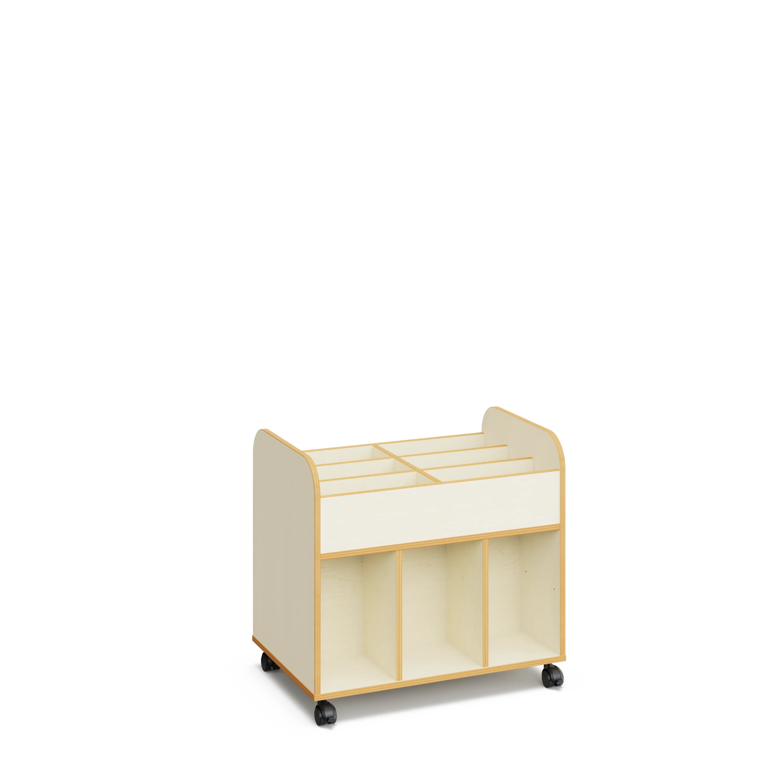 Chariot à livres DAN : meuble mobile en bois conçu pour faciliter le rangement et le transport des livres dans les écoles, crèches et bibliothèques. Sa conception robuste et pratique en fait un élément indispensable pour les environnements éducatifs.