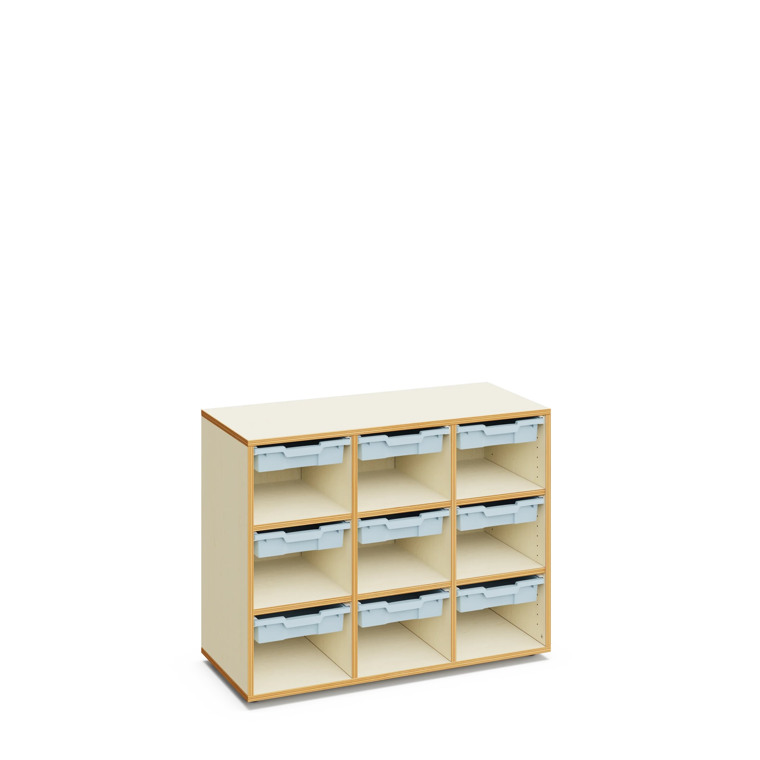 Armoire MERIT : meuble de rangement en bois équipé de bacs modulaires, conçu pour offrir une organisation pratique et esthétique dans les environnements scolaires et collectifs. Sa structure solide et son design simple permettent de créer des combinaisons multiples avec d’autres armoires de la même gamme.