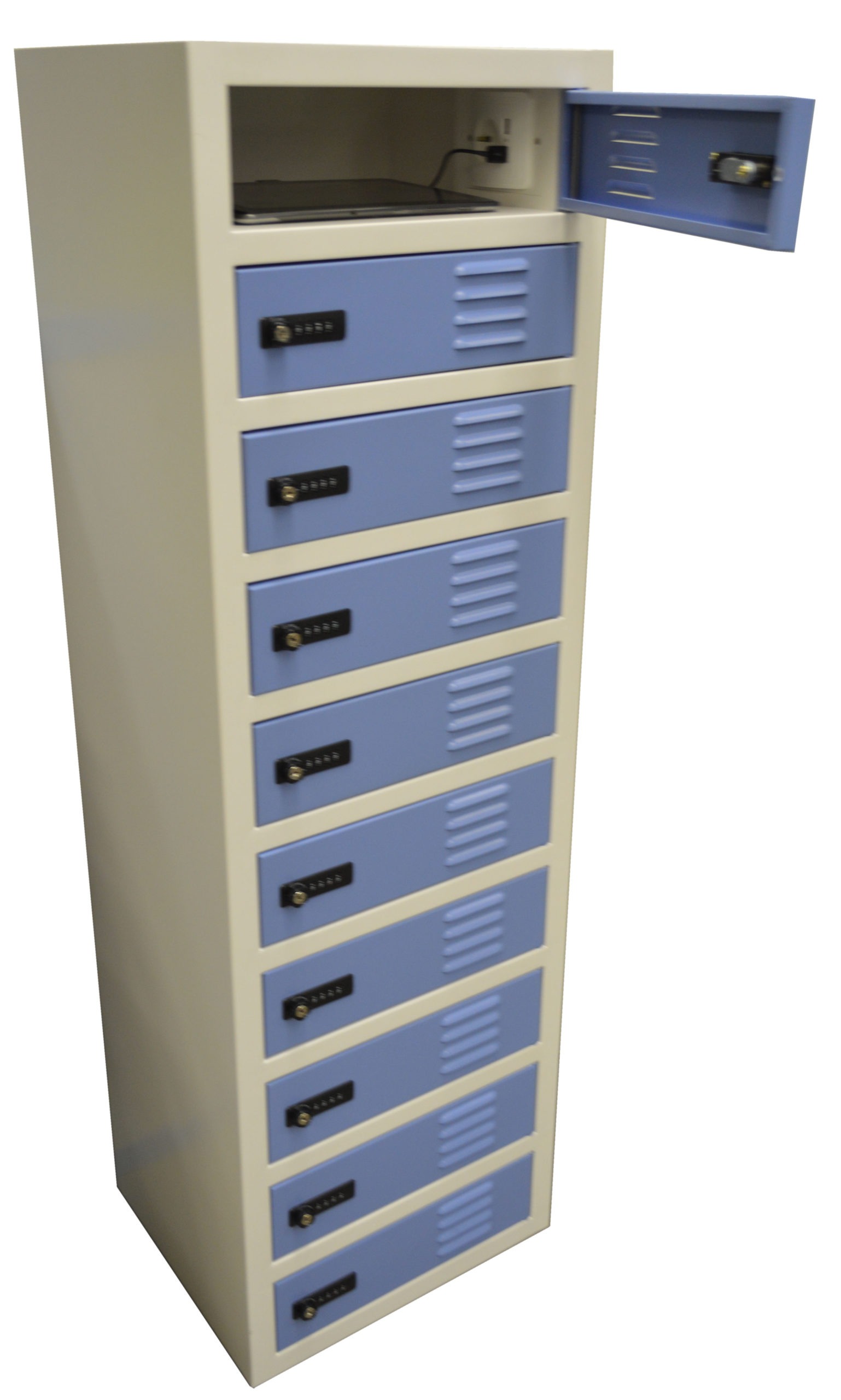 Mobilocker 10+ est une station de stockage securisee composee de 10 casiers independants avec charge integree pour tablettes, PC et smartphones.